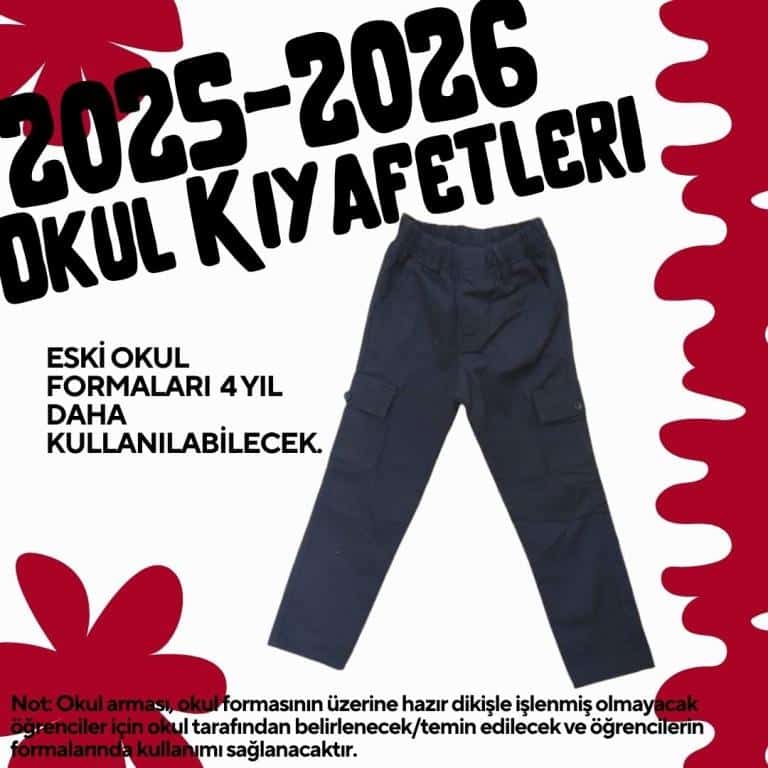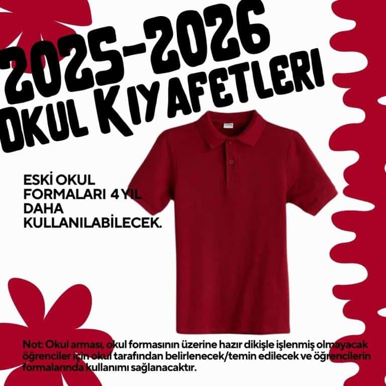 OKULUMUZDA 2025-2026 ÖĞRETİM YILINDA OKUL - AİLE BİRLİĞİ YÖNETİM KURULUMUZUN ALDIĞI KARAR GEREĞİ KIYAFET DEĞİŞİKLİĞİNE GİDİLECEKTİR. KIYAFET DEĞİŞİKLİĞİ KADEMELİ OLARAK YAPILACAKTIR. ÖNÜMÜZDEKİ YIL BİRİNCİ SINIFLARDAN BAŞLAMAK ÜZERE VE YENİ KIYAFET ALIMLARINDA UYGULANACAKTIR. ARA SINIFLARDA HİÇ BİR ÖĞRENCİMİZ KIYAFET DEĞİŞİKLİĞİ KONUSUNDA ZORLANMAYACAKTIR.